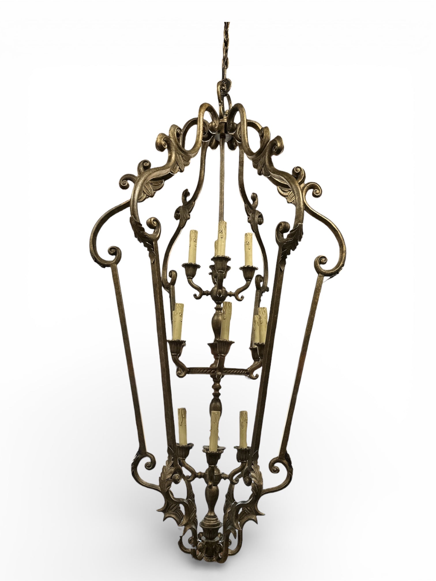 This large French-style lantern chandelier features an elongated architectural silhouette with elegant scrollwork and multiple candle-style lights arranged across tiered arms. The open lantern form creates dramatic vertical presence, while the aged metal finish highlights its sculptural character and classic European influence.