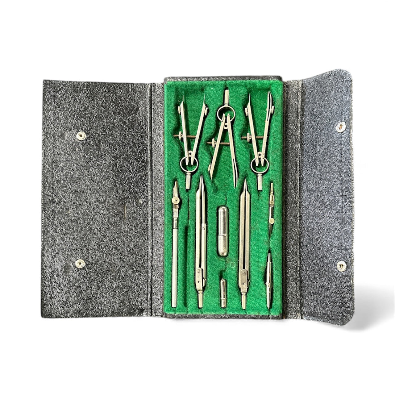 A complete vintage drafting set featuring precision compasses, dividers, ruling pens, and interchangeable points, all housed in the original textured case with a green felt interior. Crafted from nickel-plated steel, the tools offer classic mid-century engineering quality and elegant design. A beautiful collectible for architects, designers, or lovers of vintage technical instruments.